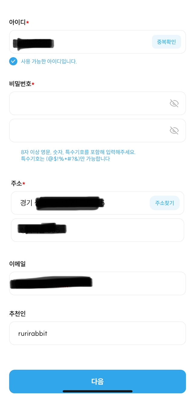 본인 인증 후 아이디, 비밀번호, 주소, 이메일 등을 넣어주시고 추천인은 저 rurirabbit 넣어주셔도 되고 안 넣어주셔도 되고요^^ 그리고 약관동의 원하시는거 해 주세요.