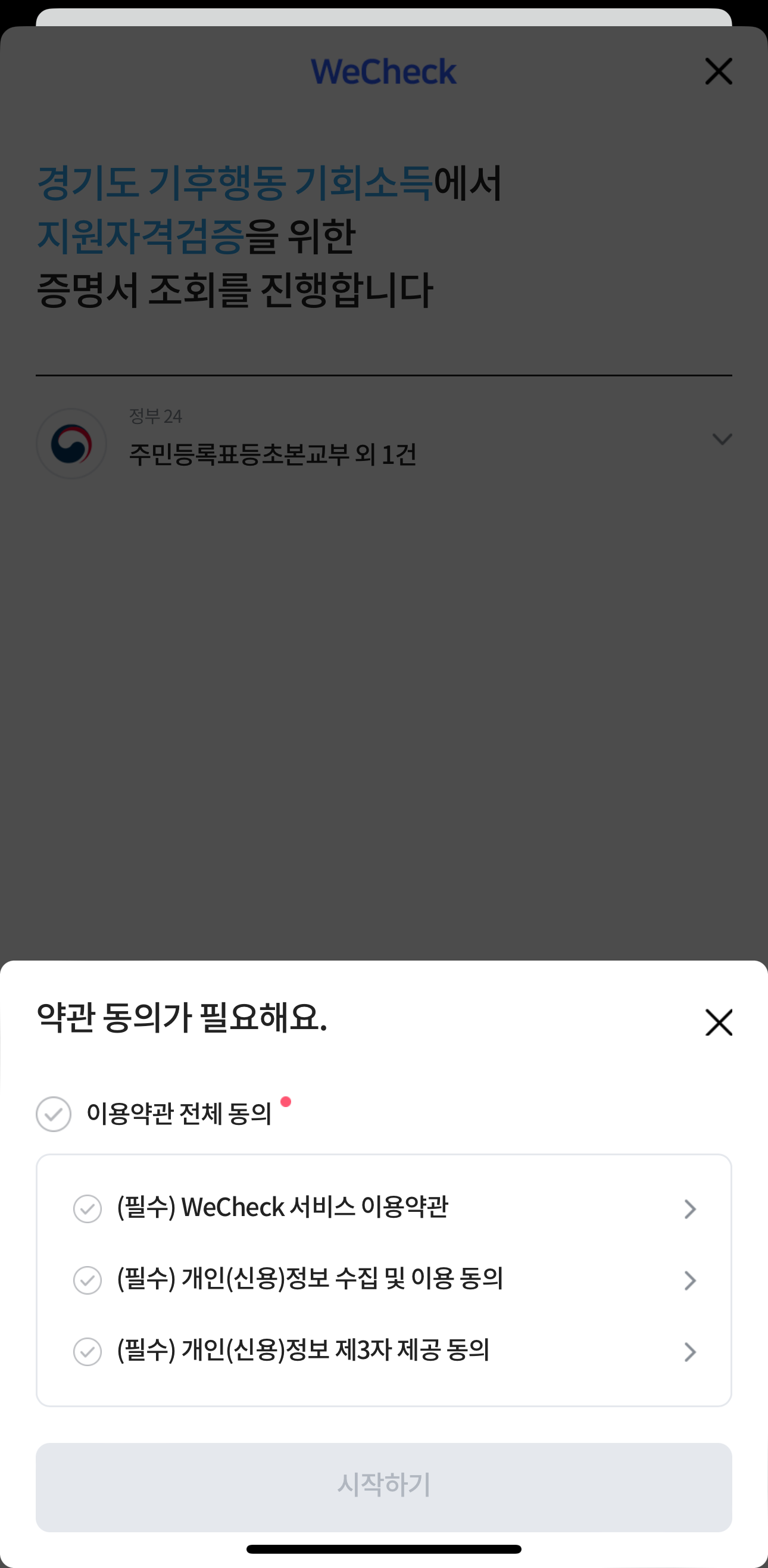 가입완료 후 시작하기를 누르면 경기도민임을 확인하는 주소검증 절차가 들어갑니다. 정부24 와 연결하여 등초본을 확인하기때문에 인증서를 미리 저장해두시면 좋아요. 저는 카카오톡 인증서를 이용하여 인증을 받았습니다.
