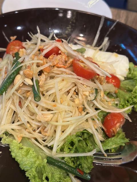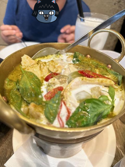 그래서 굶주린 배를 움켜쥐고 숙소 근처로 와서 태국 식당을 갔는데 제가 좋아하는 쏨땀과 그린커리를 시켜 먹었습니다. 아이가 가리지 않고 다 잘먹어줘서 여행할 때는 정말 고마웠어요.