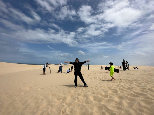 다음 일정은 샌드보딩을 하러 갔는데 눈앞에 사막이 펼쳐져 있더라고요. 진짜 사막이 아니라 해변의 모래가 바람에 날아와 사막처럼 된 것이라 하는데 정말 대단하지 않나요? 바로 사막으로 전용 트럭을 타고 샌드보딩을 할 수 있는 곳으로 갔습니다. 바람이 불고 해는 뜨거워도 모든 사람들이 보드를 들고 언덕으로 올라갔어요.