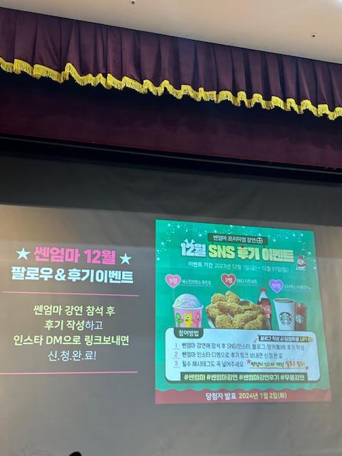 눈이 엄청 왔던 12월 20일. 유쾌한 쎈엄마 레크레이션 강사님의 진행으로 시작하여 후원사인 연세생활건강, 닥터피엘, 보람상조 등의 광고시간이 지나고 드디어 손경이 박사님이 나타나셨습니다.