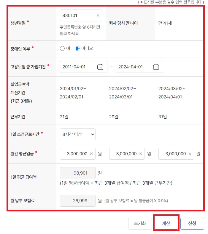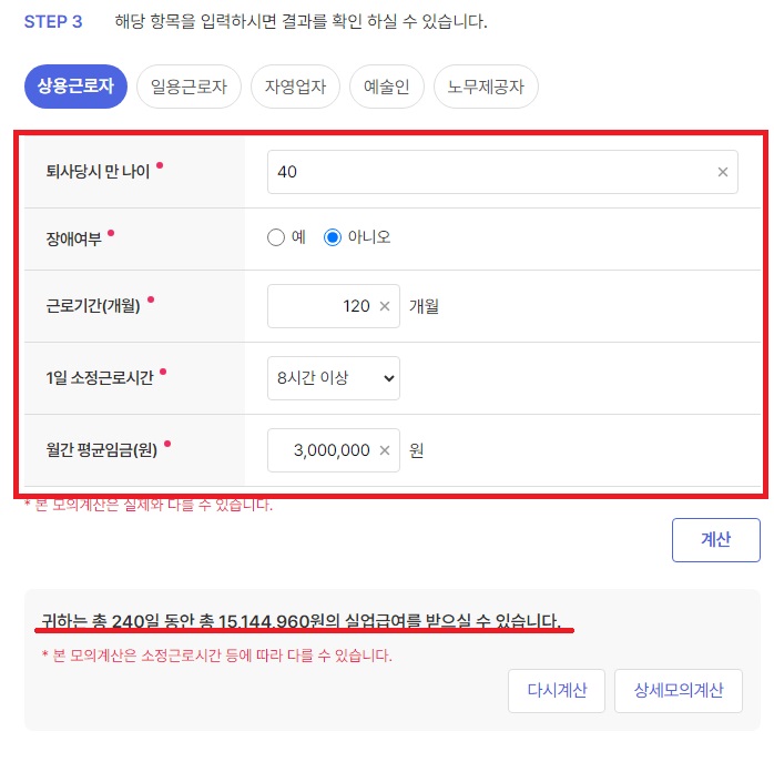 ③ STEP3. 의 항목(퇴사당시 만 나이, 장애여부, 근로기간, 1일 소정근로시간, 월간 평균임금)을 입력한 후 계산을 클릭합니다. (예: 40살, 장애 X, 120개월, 8시간 이상, 3,000,000원)