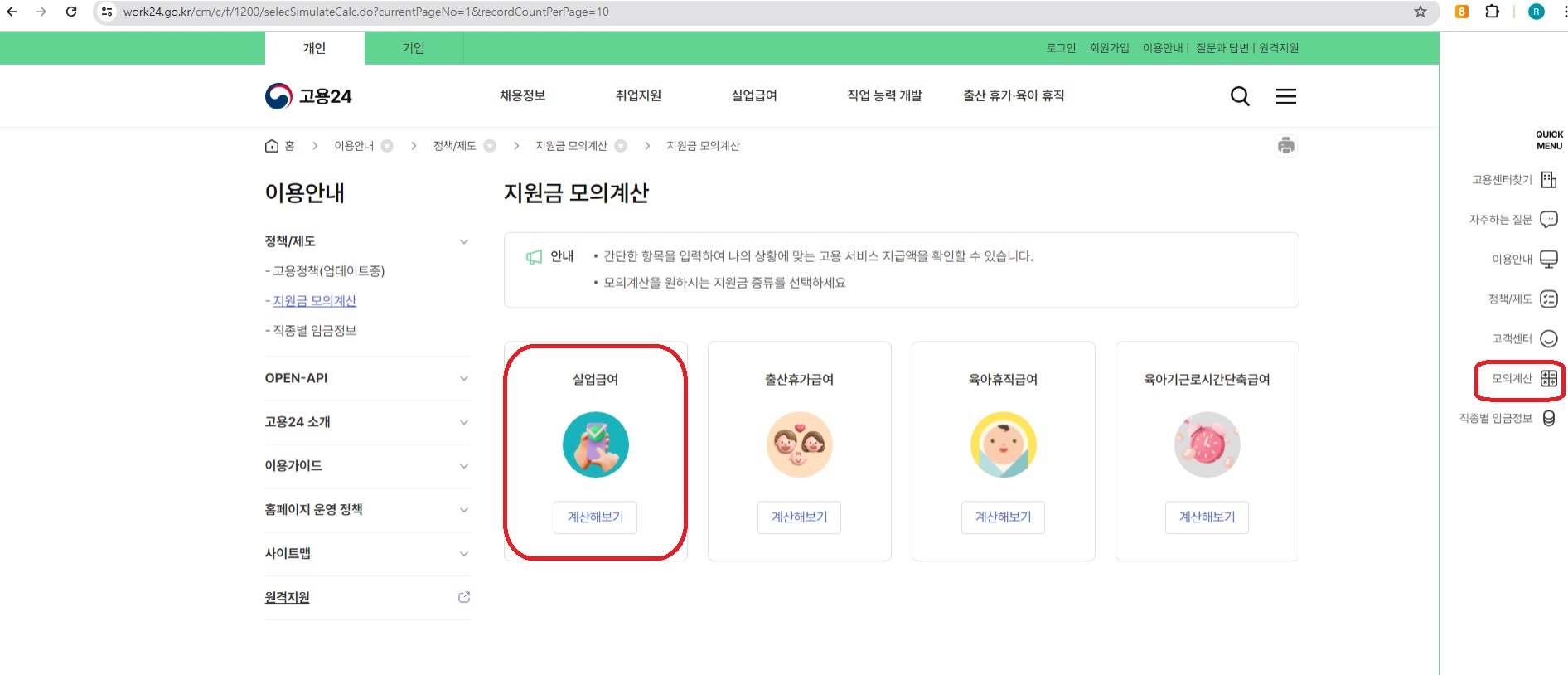 메뉴의 실업급여 계산해보기를 눌러주세요.