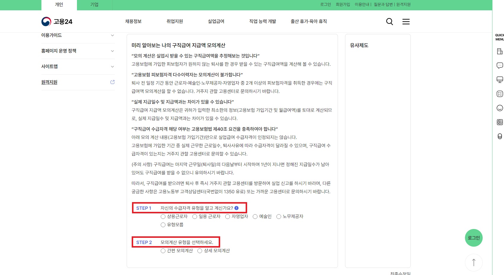 ② STEP1. 자신의 수급유형을 알고 계신가요?, STEP2. 모의계산 유형을 선택하세요. 에 맞는 것을 선택합니다. (예: 상용근로자, 간편모의계산)