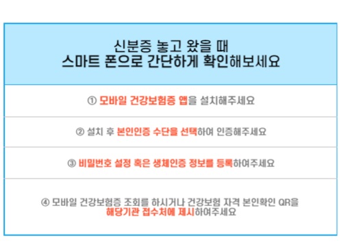 그땐 당황하시지 마시고 스마트폰을 이용하여 <모바일 건강보험증>을 제시하시면 간편하게 신분 확인이 가능합니다.