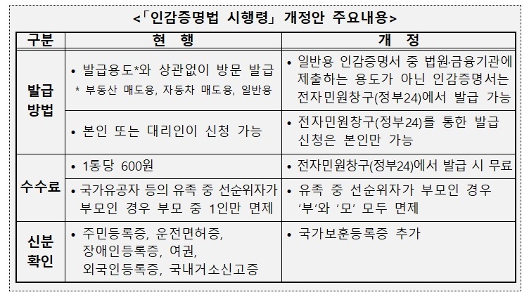 하지만 이번 인감증명법 시행령 일부개정령안으로 인해 약 500만통의 인감증명서를 <정부24>에서 편리하게 발급받을 수 있게 될 것으로 예측했습니다. 기존 인감증명서와 구분하기 쉽도록 전자민원창구용 전용서식도 신설됐습니다.