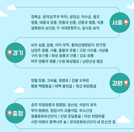 우선, 문화재청이 직접 관리하는 4대궁, 종묘, 조선왕릉은 15일부터 19일까지 닷새간 휴무일 없이 전부 무료 개방(단, 창덕궁 후원 및 유료행사는 제외), 서대문형무소, 수원 화성행궁과 남한산성 행궁, 강릉 오죽헌 등 지자체가 관할하는 54개소의 전국 유료입장 국가 유산들도 같은 기간 (5.15~19) 무료입장으로 개방되므로, 이 기간에는 무료 개방하는 지차체 관할 54개소의 국가유산은 각 지자체에 운영시간 등을 확인하여 방문하시면 됩니다.