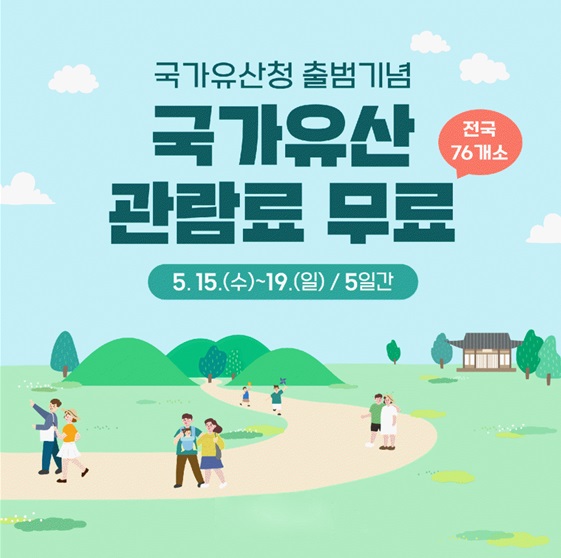 5월 15일(수)~5월 19일(일)까지 닷새동안 서울 암사동 유적, 제주 성산일출봉 등 전국의 국가유산 54개소를 포함해 총 76개소의 유료 관람 국가유산을 무료로 개방한다고 합니다.