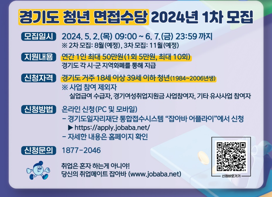 경기도청년면접수당은 경기도내 거주 중인 18세 이상 ~ 39세 이하(1984년생 ~ 2006년생) 청년에게 최대 50만원(면접 1회당 5만원, 최대 10회)으로 면접에 사용된 비용을 보전해줌으로써 경제적 부담을 경감해 주고 적극적 구직활동을 증진 시키는 청년지원 사업입니다.