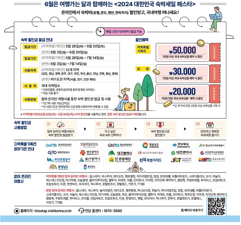 대한민국 숙박세일페스타는 국내 여행을 촉진하기 위해 정부와 민간이 협력하여 진행하는 대규모 할인 행사입니다. 이커머스업계는 문화체육관광부, 한국관광공사와 함께 6월 한달 간 호텔, 리조트, 펜션 등 다양한 숙박시설에서 할인을 제공하여 더 많은 사람들이 국내 여행을 즐길 수 있도록 돕습니다. 온라인을 통해 숙박상품을 예약할 경우 할인쿠폰을 제공하는 사업입니다.