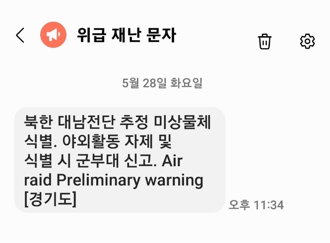 경기도 일부 지역에는 전날 오후 11시 34분 "북한 대남전단 추정 미상물체 식별. 야외활동 자제 및 식별 시 군부대 신고. Air raid Preliminary warning [경기도]" 라는 내용의 재난문자가 발송됐다.