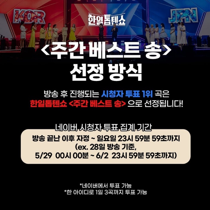 국내 최초! 국적 초월! 장르 불문! 한일 정상급 가수들이 자국의 명예를 걸고 명곡 전쟁에 출사표를 던진다. 각 주마다 1위에 뽑힌 <주간 베스트송>은 <한일톱텐쇼- 시즌 결산 왕중앙전>에 진출해 '톱텐' 대격돌을 펼치게 되는데..