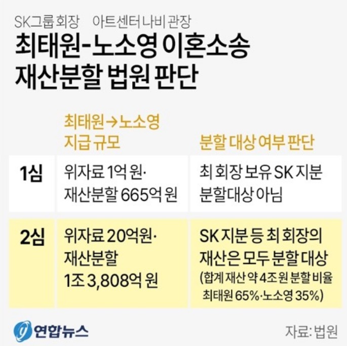 따라서 최태원 회장이 노소영 관장에게 이혼에 따른 재산 분할로 1조3천억원이 넘는 금액과 위자료 20억 원을 지급하라고 항소심 법원이 판결했습니다. 2022년 12월 1심이 인정한 위자료 1억 원과 재산분할 665억 원에서 20배 넘게 늘어난 금액이며 특히 재산분할은 현재까지 알려진 역대 최대 규모입니다.