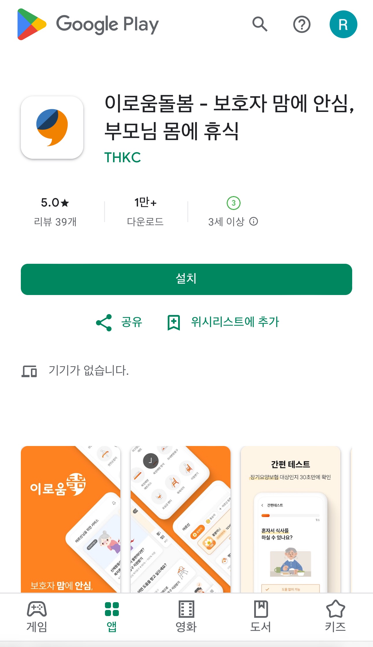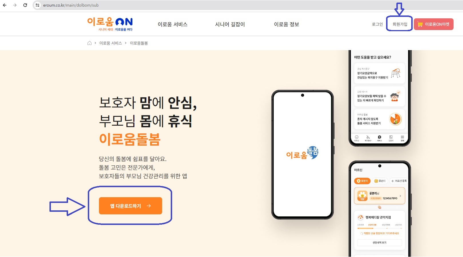 지금 현재는 플레이스토어에서 <이로움돌봄>을 검색하셔서 앱을 설치하시고 회원가입을 하시거나